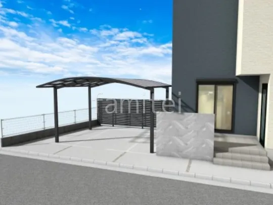 駐車スペースの雑草や砂利を撤去し、土間コンクリート仕上げに変更することで、掃除やメンテナンスがしやすいスッキリとしたスペースに仕上げました。 また、既存の植栽を撤去した箇所に大判タイル LIXIL アヴァンティのタイル門塀を新たに設置し、目隠し効果をもたらしつつモダンな雰囲気を加えました。