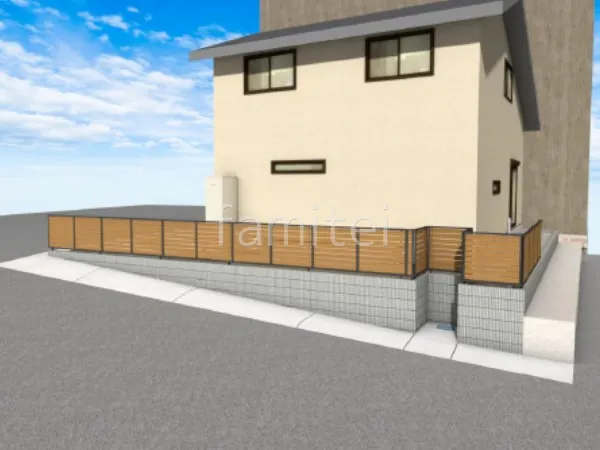 木調フェンスとレンガ目地が柔らかい雰囲気の新築ベーシック オープン外構