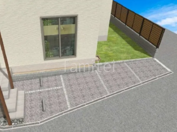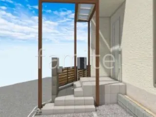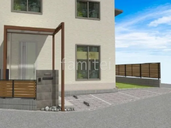玄関先にプラスGシリーズ LIXIL Gルーフを設け、雨に濡れずに玄関の出入りができるデザイン性の高いエントランスに仕上げました。 また、大判タイル タカショー セラレバンテのタイル門柱重厚感のある雰囲気をプラスしました。 ガレージの土間は洗出し仕上げとすることで、タイヤ痕が目立ちにくく、滑りにくい利便性の高さを実現しました。 敷地境界には目隠しフェンス LIXIL 木製調AB YS3型を設置し、景観に温かみを持たせながらプライバシーを確保しています。
